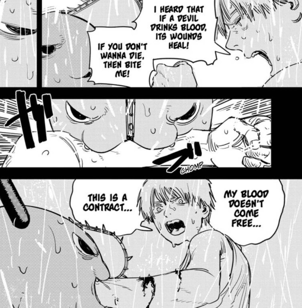 Denji is a devil hunter, a profession where you are paid to slaughter devils. After this introduction, we see a bit of Denji’s youth. After the death of his parents, Denji encounters a the Chainsaw Devil (also known as Pochita), who is hurt and in the form of a dog. Denji pities Pochita, and makes a contract with it by feeding it his blood to heal it.